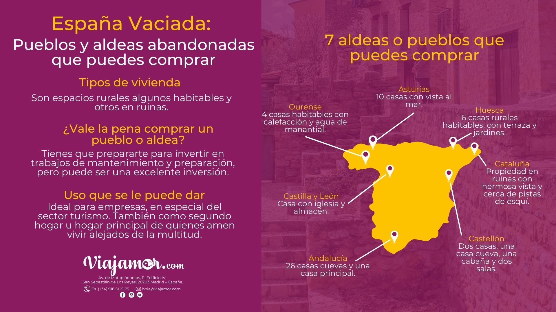 España cuenta con una buena cantidad de poblaciones fantasma que están disponibles para su compra. Se calcula que son más de 3 mil los pueblos y aldeas abandonadas, algunas de ellas con condiciones tan extremas que solo es compensado por el encanto de su ambiente.